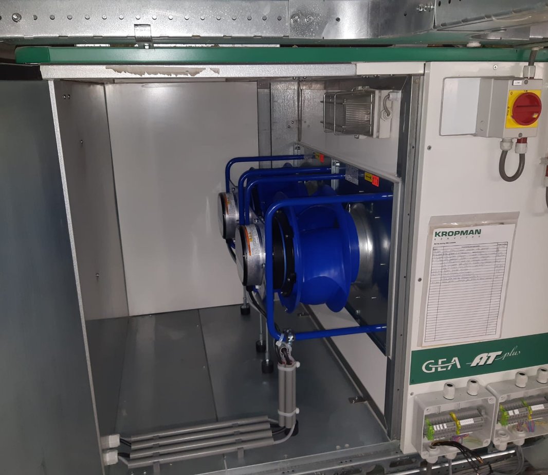 Een bijkomend voordeel is dat het debiet van de luchtbehandelingskasten nu is verdeeld over meerdere ventilatoren. Als een ventilator uitvalt, kan de andere ventilator het debiet volledig op zich nemen. Hierdoor is de luchtbehandelingskast niet alleen geluidsarmer geworden, maar is ook de bedrijfszekerheid verhoogd. Met deze aanpassingen voldoen de luchtbehandelingskasten gelijk aan de ERP 2023 norm.